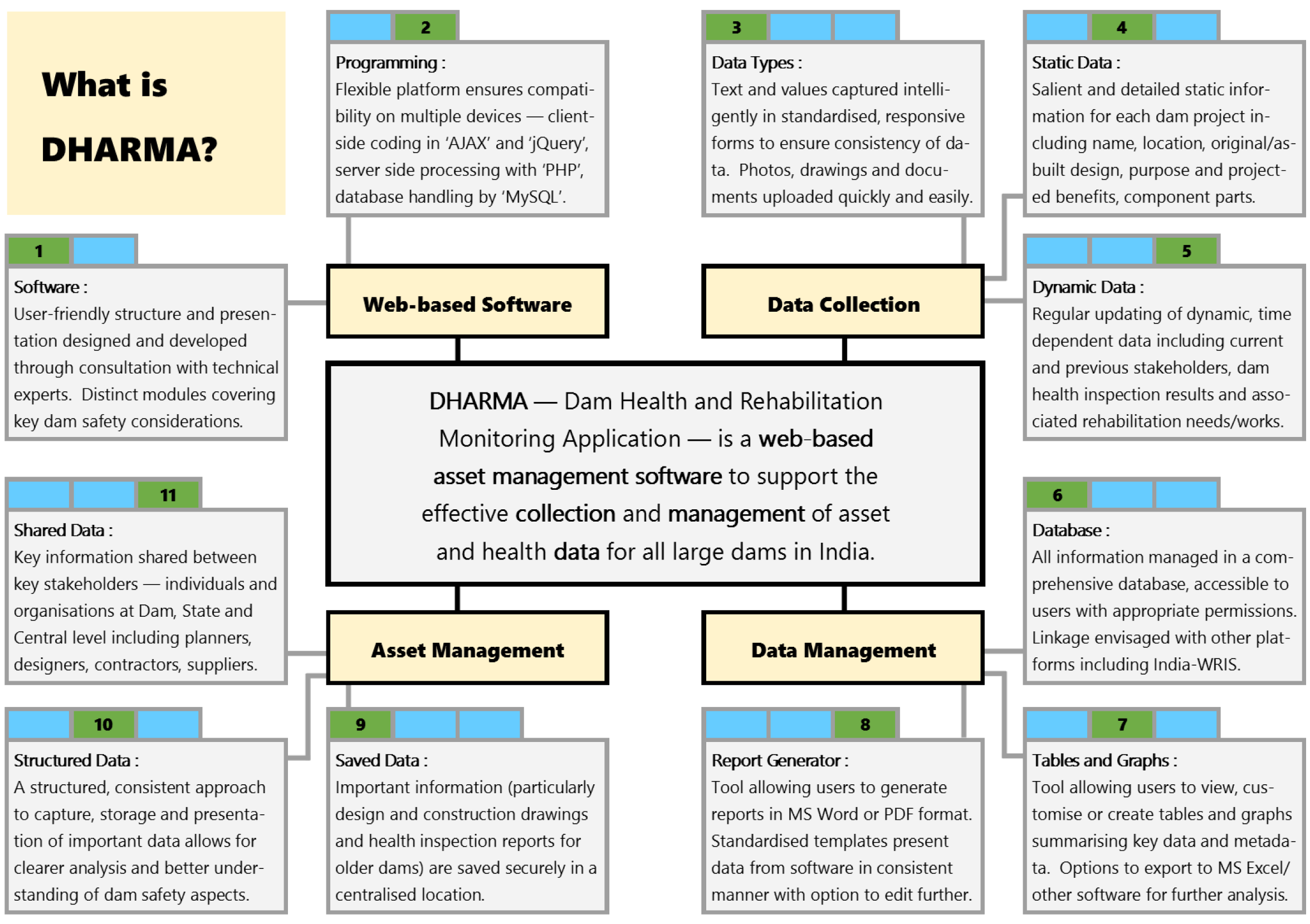 DHARMA will enable gathering and updating of dam asset infor- mation in a centralised and structured manner so as to overcome limi- tations of multiplicity of agencies, wide geographical spread, volumi- nous data, varied terminologies and units, unknown and mismatched time reference and inconsistent formats.
